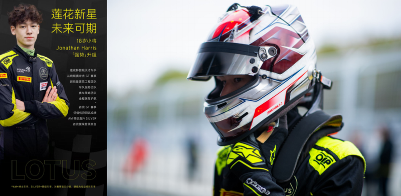 此次赛事中,由莲花杯发掘并培养的18岁潜力新星Jonathan Harris的亮相尤为引人注目。在早前参与的莲花杯赛事中,Jonathan便在排位赛获取全场最快圈速,其卓越天赋迅速获得莲花的关注与认可。莲花凭借其成熟的金字塔式赛事培训及运营体系迅速锁定这位年轻车手,并邀请其前往宁波赛道参与EMIRA GT4赛车的专业测试。测试过程中,Jonathan对GT赛事及莲花GT4的性能展现出浓厚兴趣与出色适应力,莲花随即决定调动莲花工程团队、车队服务团队、赛车策略团队为他提供比赛全程专业支持,助其夯实基础、提升赛道表现。