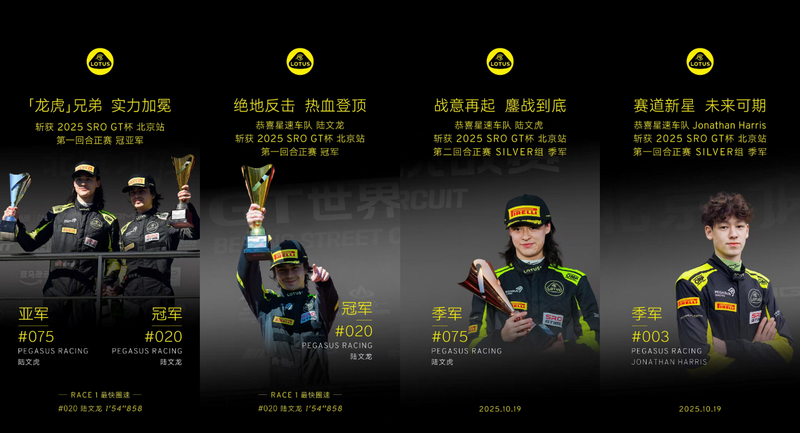 【中国北京,2025年10月20日】10月19日,SRO GT杯第三站在北京亦庄街道赛道燃情开赛。拥有77年纯血赛道基因的莲花跑车再度火力全开,星速车队(Team Pegasus)在本站比赛以三台莲花EMIRA GT4赛车的阵容出征,冲击最高领奖台:最终,20号陆文龙末位发车,上演绝地反击最终斩获首回合正赛全场第一,Silver组别冠军,3号Jonathan Harris和75号陆文虎次回合勇夺组别季军!三位车手均展现出势不可挡的蓬勃声势,共同为广大车迷献上一场巅峰竞速盛宴。