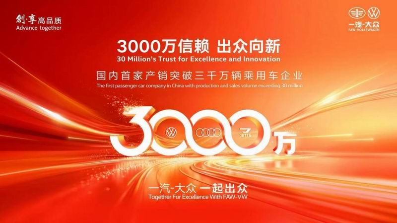 在中国汽车工业发展的浪潮中,一汽-大众即将迎来一座崭新的里程碑——累计产销突破3000万辆,成为国内首家达成这一成就的乘用车企业。这不仅是数字的跨越,更是三十四载砥砺奋进的见证,承载着3000万客户的信赖与支持。站在3000万辆的新起点,一汽-大众正以全面转型之力,为经济高质量发展开拓新增长极,以更强劲的创新驱动力,培育发展面向未来的新质生产力。