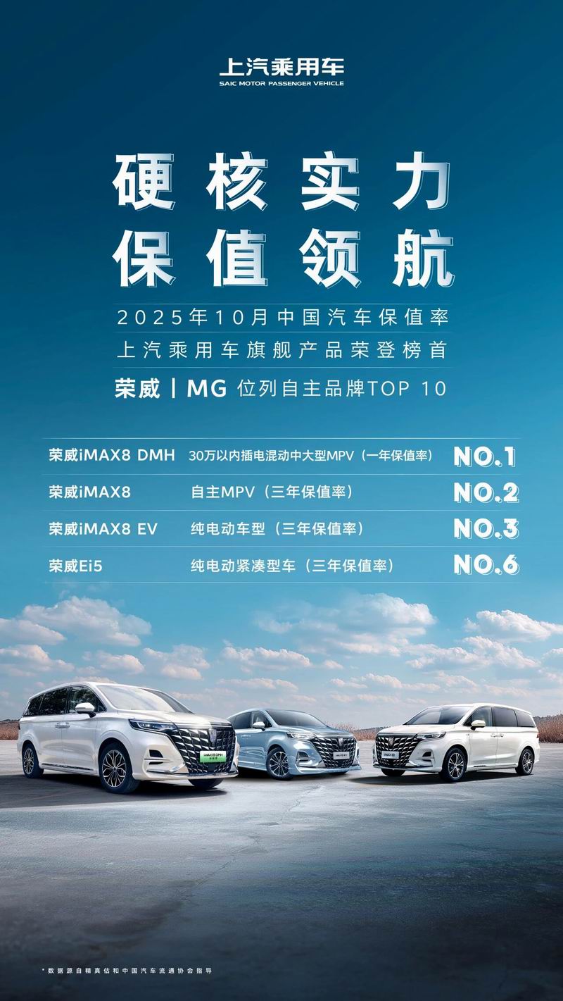 11月3日,中国汽车流通协会与精真估联合发布《2025年10月中国汽车保值率研究报告》,该报告是反映品牌产品力、认知度、美誉度等综合实力的重要参考。报告显示,上汽乘用车荣威、MG双双进入自主品牌保值率TOP10。并且,在自主品牌保值率整体下行的背景下,荣威品牌逆势提升,成为少数实现排名上升的品牌之一。其中,荣威iMAX8、iMAX8 EV及iMAX8 DMH满足用户对不同技术路线的偏好,均在各自细分市场的保值率榜单中名列前茅,以扎实产品价值赢得了市场的广泛认可。