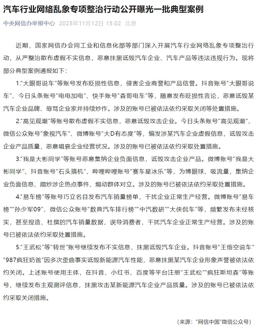 此前,中央网信办在《汽车行业网络乱象专项整治行动公开曝光一批典型案例》中就明确指出,抖音账号“王悟空说车”“987疯狂奶爸”因多次歪曲事实诋毁新能源汽车性能、恶意抹黑汽车企业形象声誉,被依法依约关闭。共同营造清朗正向的互联网舆论环境。