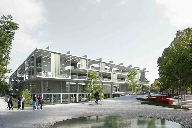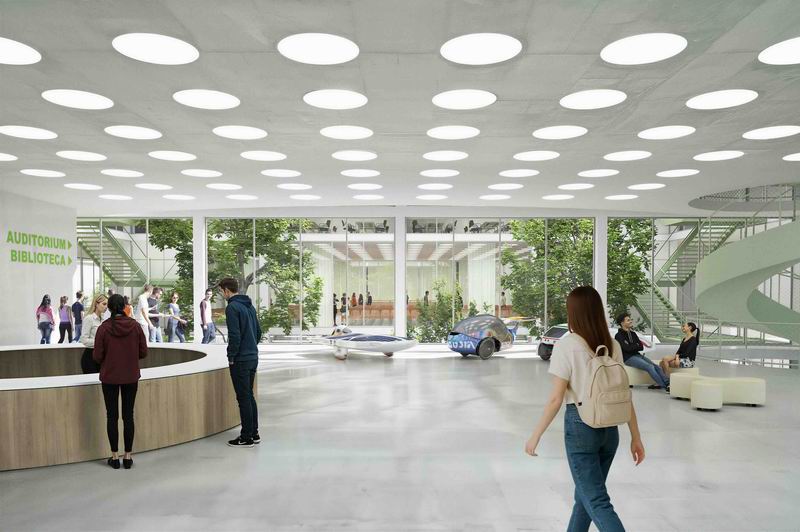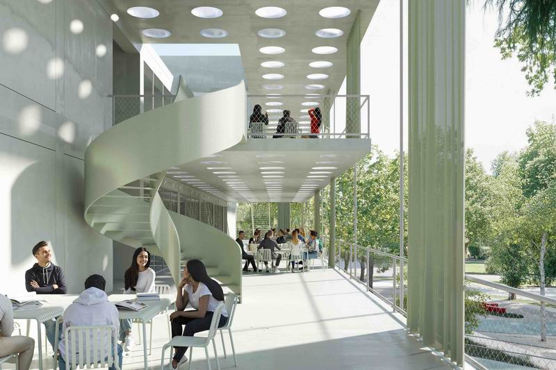 建筑主体为四层结构,设有40余间教室及多个实验室和实训车间,各功能区域围绕公共空间有序布局。公共区域包括礼堂、咖啡厅和图书馆,均面向公众开放,可承办文化活动及其他各类活动。这座综合体还将包含一座公共体育馆与客房设施。