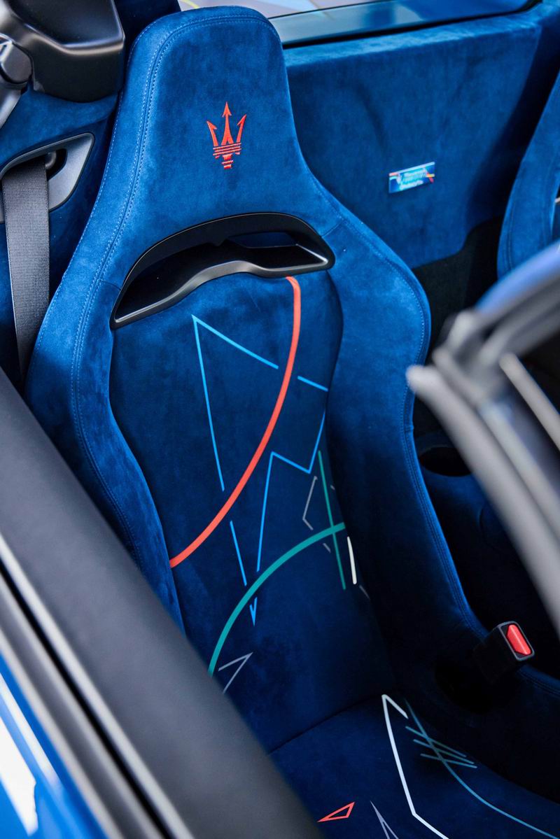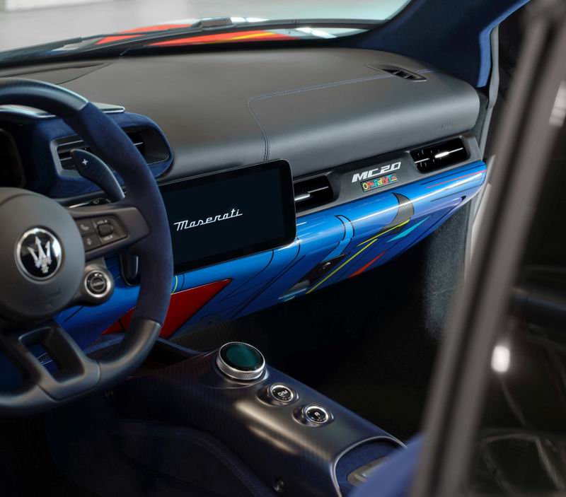 秉承Fuoriserie私享定制项目的核心理念,MC20“Opera d’Arte”敞篷特别版的内饰化身“个性表达的画布”。仪表台下缘的手绘细节与上方皮革包覆和谐交融,赋予驾乘者沉浸于艺术孤品的专属氛围。匠心与抽象美学亦延伸至外观,轮毂缀以独特的彩色图形细节,进一步强化整车的视觉表现力。