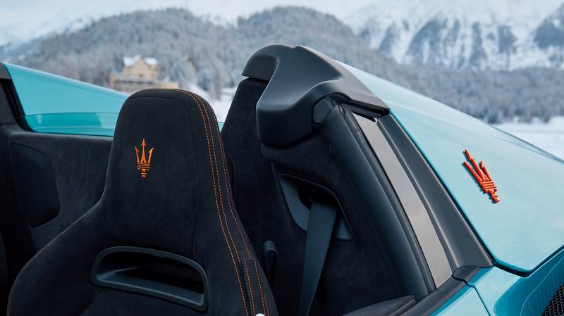 在这片浸润独特意境的冰雪盛境中,三叉戟品牌的专属定制座驾,凭借充满个性风格的AI幻彩蓝(AI Aqua Rainbow)涂装,登场即成为全场焦点。这款独特的虹彩漆面,可随光线流转幻化层叠色调,宛若冰川凝炼的澄澈晶面,清透莹润,意境天成。与此明亮冷冽的基底形成强烈对比的,是车身各处专属定制的亮橙饰件,以热烈质感勾勒出温暖跃动的能量感,冷暖相映,张力尽显。橙色的梦想线条涂装、 驼峰式后舱盖上的橙色三叉戟徽标、外部标识、玛莎拉蒂字母以及Cielo徽标,共同构成了醒目而独特的图形元素,于皑皑雪境中卓然生辉。高光黑色下包围与20英寸Cyclonic高光黑色Fuoriserie专属轮辋相得益彰,辅以橙色制动卡钳,及同色呼应的橙色轮毂盖与三叉戟精饰细节,令这份视觉冲击力再度进阶。