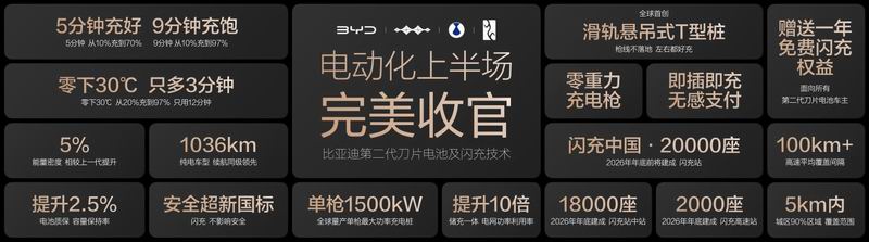 2026年3月5日,比亚迪在深圳大运中心体育馆召开“闪充中国 改变世界”发布会。正式发布:第二代刀片电池及闪充技术,创造全球量产最快充电速度新纪录,从10%到70%,只用5分钟就能充好;从10%到97%,只用9分钟就能充饱;零下30度,从20%到97%,只比常温多3分钟。一举攻克了电动化上半场“充电慢”和“低温充电难”的世界性难题,电动化上半场至此完美收官。同时,发布“闪充中国”战略,年底将在全国建设20000座闪充站,让用户充电更自由、更便捷,从此新能源汽车充电迈入闪充时代,开启闪充新纪元。