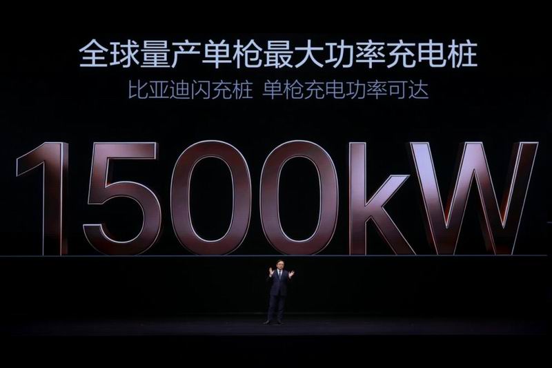 为实现第二代刀片电池的闪充速度,比亚迪还全新开发了闪充桩,单枪充电功率做到了:1500kW!是全球量产单枪最大功率充电桩!配合超级快放的储能系统,突破了电网容量限制,而且绝不会伤害电网,是对社会最友好的充电解决方案。
