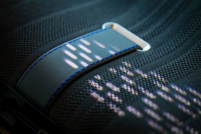 在全新MINI Paul Smith设计师款中,这项技术展现了极致的艺术表现力。Paul Smith标志性的暗调条纹就是通过三种不同粗细的针法,将结构感与立体感精准织入。这种内敛低调的纹理,配合纱线本身的触感,完美呈现了电动MINI COOPER PAUL SMITH设计师款克制的设计风格,更如同一块极具质感的艺术底色,衬托出座舱内的亮眼细节:龙葵蓝运动座椅、由10种颜色彩条组成的方向盘编织绑带,以及圆形OLED屏内内置的3款专属壁纸。