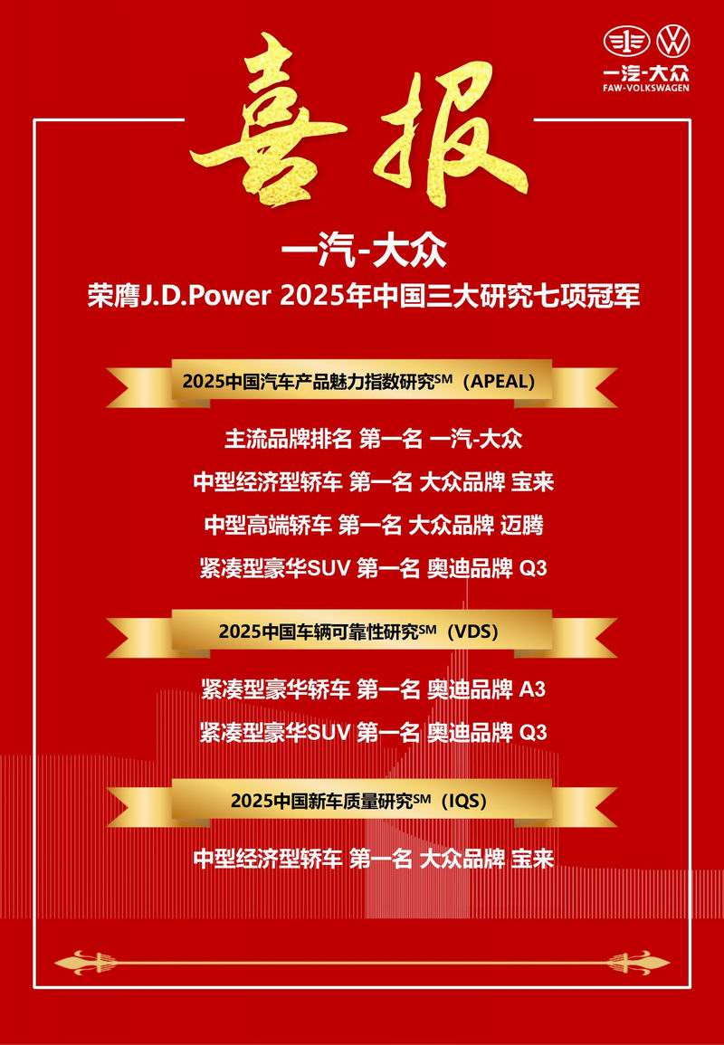 3月19日,全球领先的消费者洞察与市场研究机构J.D. Power|君迪在武汉举行2026年度论坛暨颁奖典礼,公司荣膺2025年中国三大研究七项冠军。其中,在2025中国汽车产品魅力指数研究SM(APEAL)中,公司获得主流品牌第一名,大众宝来、大众迈腾、奥迪Q3分列各细分市场魅力指数第一名;在2025中国车辆可靠性研究SM(VDS)中,奥迪A3、奥迪Q3分列紧凑型豪华轿车、SUV第一名;在2025中国新车质量研究SM(IQS)中,大众宝来获得中型经济型轿车第一名。J.D. Power作为全球领先的消费者洞察和市场研究机构,其基于真实车主反馈的奖项在行业内具有极高权威性,此次一举斩获多项研究冠军,不仅是公司卓越商品品质与可靠性的有力印证,也深刻体现了广大消费者对品牌与商品的高度认可与信赖。