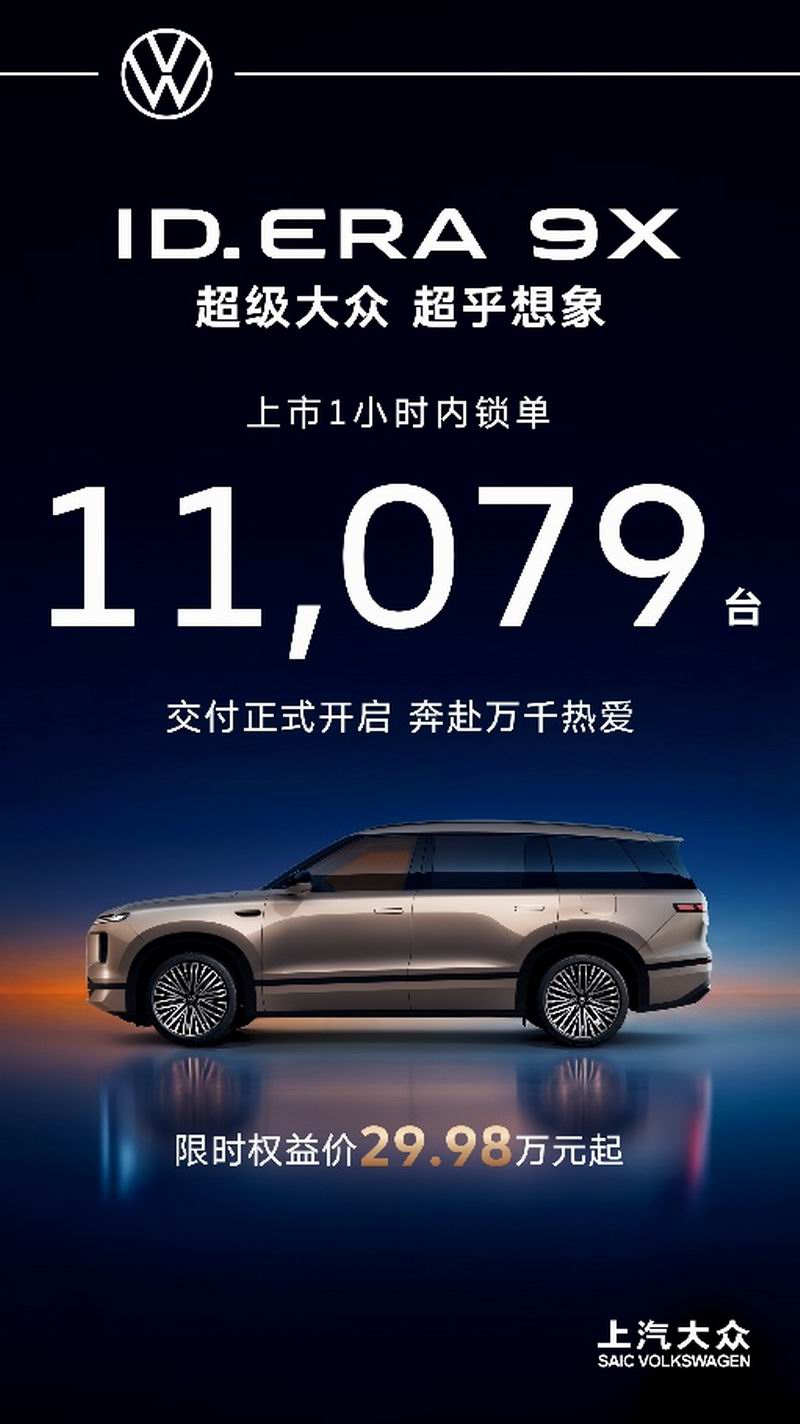 在4月25日北京车展上,ID. ERA 9X正式上市,凭借29.98万元起(*4月25日-5月31日,详情请洽当地经销商)的限时权益价瞬间引爆市场,上市仅1小时内,锁单量便达到11,079台。与此同时,ID. ERA 9X全国多地同步开启交付,提车仪式氛围感拉满,新车陆续奔赴千家万户。