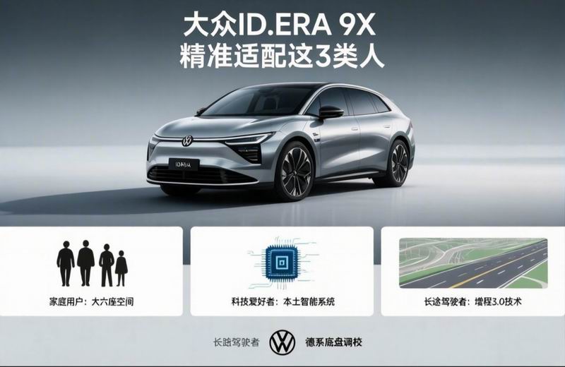 结合全网宣传亮点与用户需求画像,这款车精准贴合3类核心人群。一是多孩家庭用户,尤其是经常全家出行、注重空间与安全的家庭;二是常跑长途、有续航焦虑,但又想兼顾纯电通勤体验的自驾爱好者;三是信赖德系品质,追求“可靠耐用”,拒绝新势力“短期迭代”风险的理性消费者。这三类人群的核心需求,恰好与ID.ERA 9X的宣传卖点高度契合,也是其区别于理想L9、问界M9的核心优势所在。