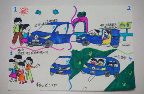 另一位获奖的小朋友李卓心然则采用了写实的风格,记录了一次和父母乘坐夏朗前往动物园游玩的经历。虽是简单的四格画面,却勾勒出了全家人幸福洋溢的样子。