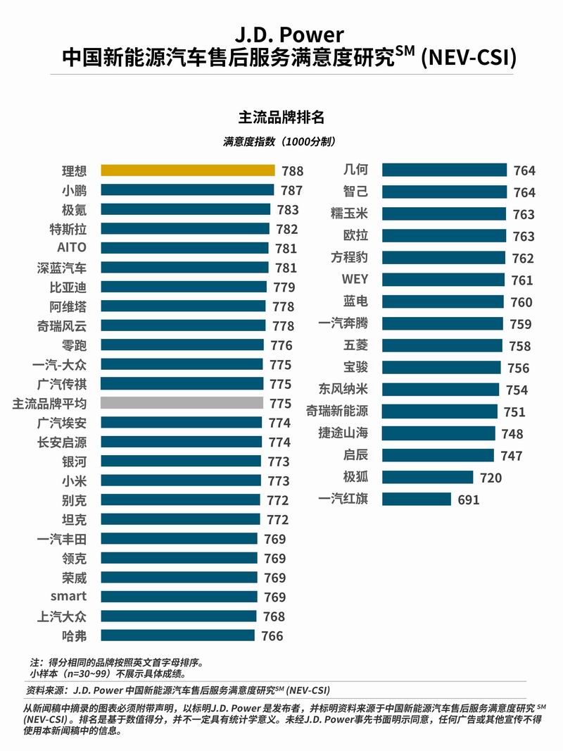 理想以788分获得主流品牌新能源汽车售后服务满意度冠军。