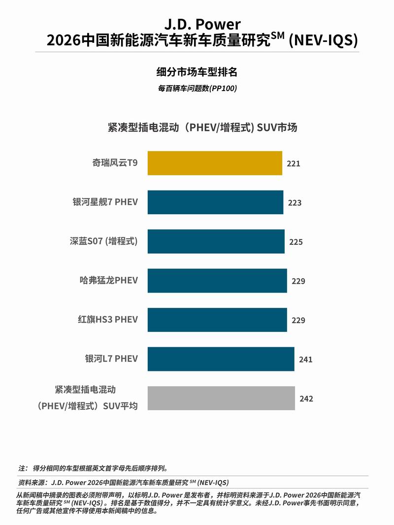SM(NEV-IQS),是J.D. Power连续第八年在中国发布这一研究,该研究基于J.D. Power行业通用的新车质量研究IQS体系,并针对新能源车特有问题进行补充,该研究统计和衡量了新能源汽车新车车主在2至6个月的拥车期内遇到的质量问题。新车质量以平均每百辆车问题数(PP100)表达,问题数越低,质量越好。