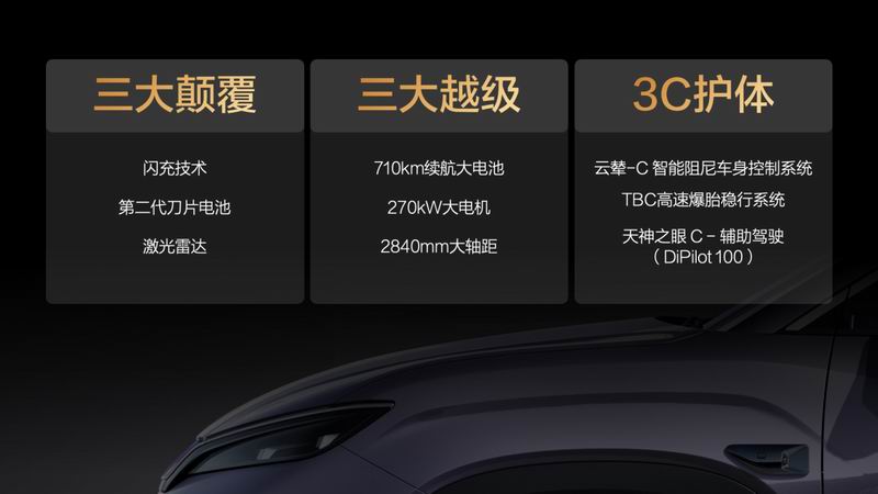 除了“第二代刀片电池、闪充技术及激光雷达”带来的三大颠覆,宋Ultra EV还带来了“三大越级、3C 护体”。宋Ultra EV的电机最大功率为270kW,为多种场景尤其是高速行驶带来了充沛的动力,其最高时速可达210km/h。