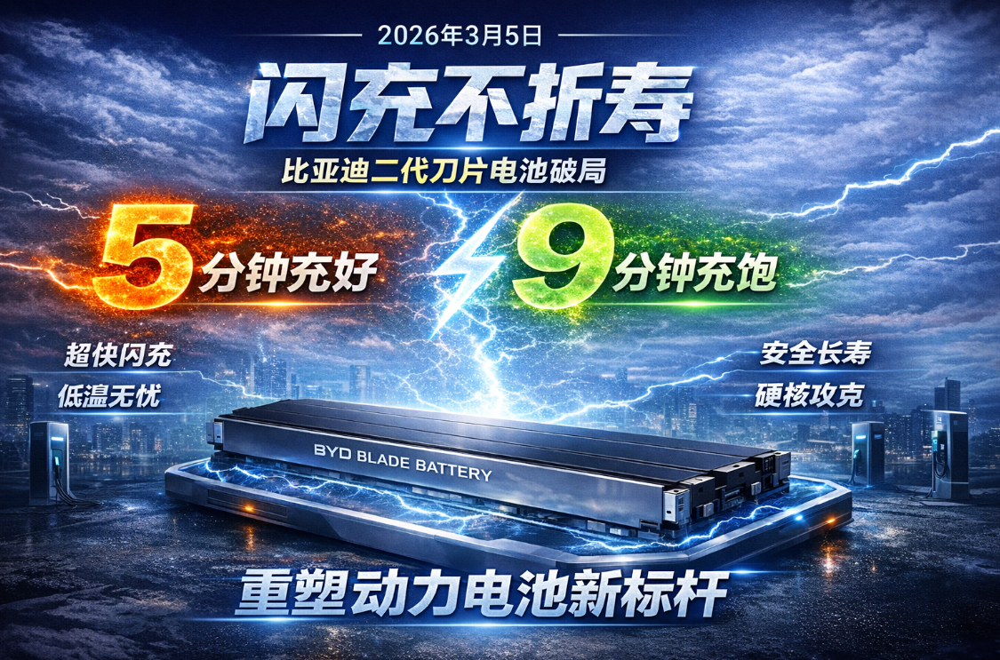2026年3月5日,比亚迪正式发布第二代刀片电池,凭借常温5分钟充好、9分钟充饱,零下30度低温仅多3分钟的闪...