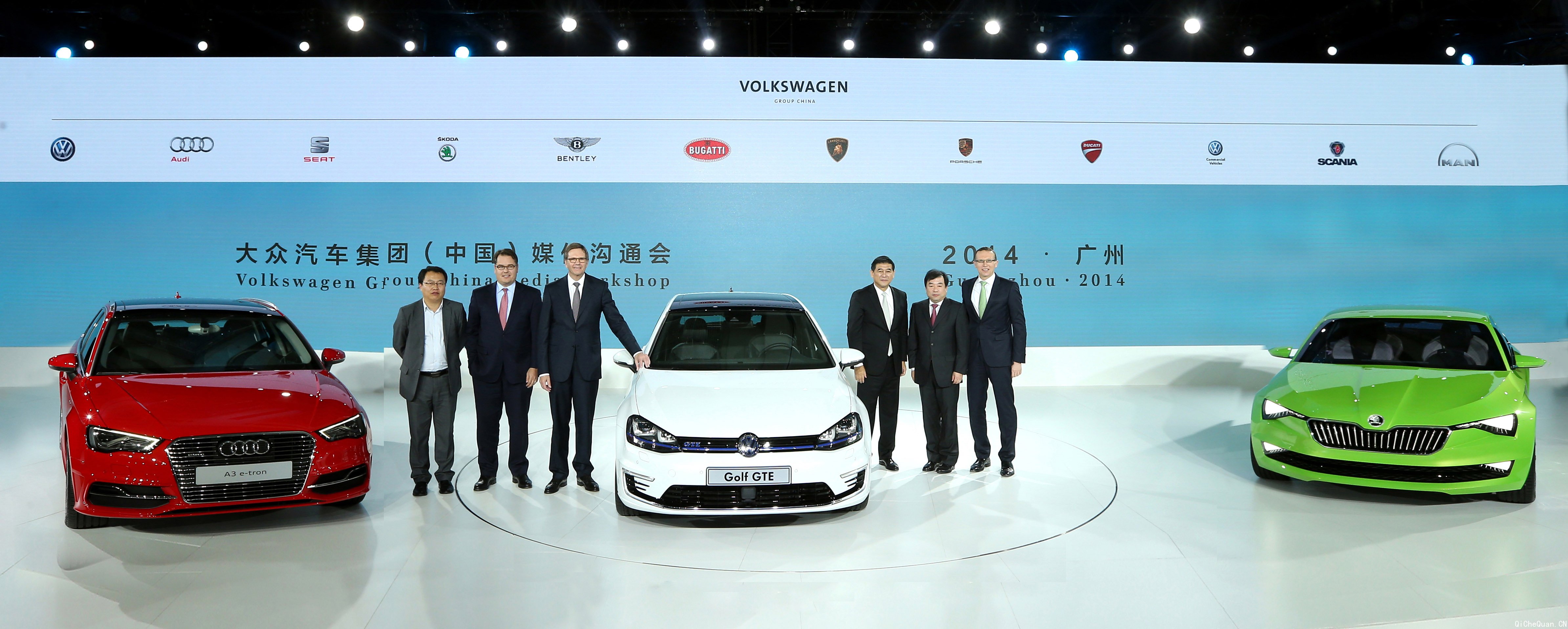 (左起)中国妇女发展基金会家庭工作部主任梁学军、奥迪中国总经理、奥迪股份公司副总经理冯德睿博士 (Dr. Dietmar Voggenreiter)、大众汽车集团管理董事会成员、大众汽车集团(中国)总裁兼CEO海兹曼教授(Prof. Dr. Jochem Heizmann)、大众汽车集团执行副总裁、大众汽车集团(中国)董事、执行副总裁苏伟铭(Weiming Soh)、中国足协市场部副主任朱琪林和斯柯达中国总裁、大众汽车集团(中国)执行副总裁韩麦安(Andreas Hafemann)在广州车展开幕前举行的大众汽车集团(中国)媒体沟通会上合影