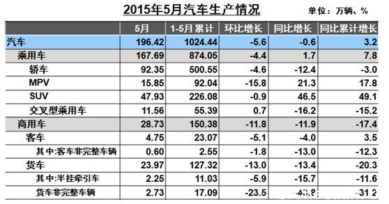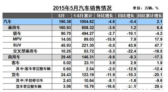 中汽协最新数据显示,5月,汽车产销分别完成196.42万辆和190.38万辆,比上月分别下降5.6%和 4.6%;与上年同期相比产销量分别下降0.6%和0.4%,1-5月,汽车产销分别完成1024.44万辆和1004.62万辆,比上年同期分别增长 3.2%和2.1%。月度累计增幅继续回落,比上年同期分别回落6.2和6.9个百分点。中汽协副秘书长姚杰在接受中国经济网记者采访时表示,汽车产销增 速回落的形势与中央提出的经济“新常态”一致,我国汽车工业进入低速增长期。 5月,乘用车产销环比回落,同比继续保持增长,但增幅呈现较大回落。5月乘用车产销分别完成167.69万辆和160.93万辆,产销量比上月分别下降4.4%和3.6%;与上年同期相比,产销分别增长1.7%和1.2%,增幅分别回落14.5和12.7个百分点。