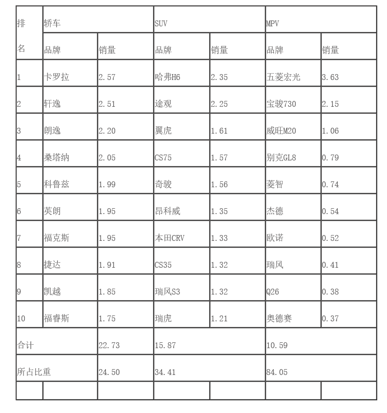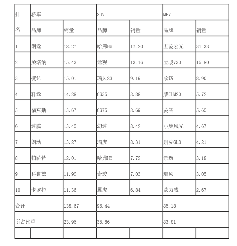 2015年上半年乘用车品牌销量前十位排名(单位:万辆) 上半年,中国品牌乘用车共销售418.46万辆,同比增长14.57%,占乘用车销售总量的41.45%,占 有率比上年同期提升3.54个百分点。德系、日系、美系、韩系和法系乘用车分别销售198.83万辆、150.78万辆、121.75万辆、81.34万 辆和36.55万辆,分别占乘用车销售总量的19.69%、14.94%、12.06%、8.06%和3.62%。与上年同期相比,上述外国品牌市场占有 率均呈一定下降,德系降幅更大。 6月,销量排名前十位的轿车生产企业依次为:上海大众、上汽通用、一汽大众、东风日产、长安福特、一汽丰田、 北京现代、神龙汽车、广汽本田和长安股份。与上月相比,上海通用销量增速居前、长安福特和一汽丰田呈小幅增长,其他企业呈不同程度下降。6月,上述十家企 业共销售59.97万辆,占轿车销售总量的70.87%。 6月,销量排名前十位的SUV生产企业依次是:长城汽车、长安股份、长安福特、上汽通用、东风日产、上海大 众、东风本田、江淮股份、北京现代和华晨汽车。与上月相比,长安福特销量增速最为明显,东风本田、上海大众和华晨汽车增速超过10%,市场表现同样突出。 6月,上述十家企业共销售24.99万辆,占SUV销售总量的55.76%。 6月,销量排名前十位的MPV生产企业依次是:上汽通用五菱、东风汽车、北汽银翔、上汽通用、长安股份、东风 本田、北汽股份、奇瑞汽车、江淮股份和广汽本田。与上月相比,北汽银翔销量增速最快,广汽本田增速居次、东风本田和上汽通用略有增长,其他企业呈一定下 降。6月,上述十家企业共销售11.56万辆,占MPV销售总量的91.75%。 6月,销量排名前十位的交叉型乘用车生产企业依次是:上汽通用五菱、长安股份、重庆力帆、金杯汽车、东风汽 车、北汽股份、一汽集团、奇瑞汽车、江西昌河和福建新龙马。与上月相比,奇瑞汽车销量增速最为显著,金杯汽车和福建新龙马也呈较快增长,一汽集团和上汽通 用五菱增速略低,其他企业有所下降。6月,上述十家企业共销售8.93万辆,占交叉型乘用车销售总量的98.19%。 此外,新能源汽车继续保持强劲增长:6月新能源汽车生产19153辆,销售21055辆,同比分别增长2.7 倍和2.4倍,其中纯电动汽车产销分别完成12864辆和14699辆,同比分别增长3倍和2.7倍;插电式混合动力汽车产销分别完成6289辆和 6356辆,同比增长2.1倍和1.8倍。 今年上半年,新能源汽车共生产76223辆,销售72711辆,同比分别增长2.5倍和2.4倍。其中纯电动 汽车产销分别完成49042辆和46219辆,同比分别增长3倍和2.9倍;插电式混合动力汽车产销分别完成27181辆和26492辆,同比增长2倍和 1.9倍。 (责任编辑:房静) |