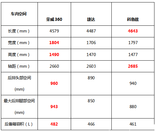 从车身尺寸上来看,荣威360除了在整车车身长度和轴距上微微逊于科鲁兹外,其他的宽度,高度,行李舱容积,后排头部空间,腿部空间均优于其他两款车的数据。在整车容积上来讲,960mm的后排头部空间与943mm的最大后排腿部空间,均达到同级最大,就算是1米8以上的大个子乘坐也完全不会觉得压抑。而领先同级的482L超大行李箱,对于喜欢“携家带口”出行的车友们来说,足够装载一家老小出行的大包小包。而与之能PK的经典科鲁兹后排头部空间也达到940mm, 461L的后备箱空间的数据已经算是同级车中的佼佼者,但是相比于荣威360的漂亮数值而言,还是稍显逊色。而对于捷达的整车容积来说,也许算是大众的通病,中规中矩,并不会有大的突出点,更加符合大众一贯的造车风格。此外,荣威360内部有多达25处储物格设计,包括驾驶座下方都有储物格,空间利用率之高可见一斑。