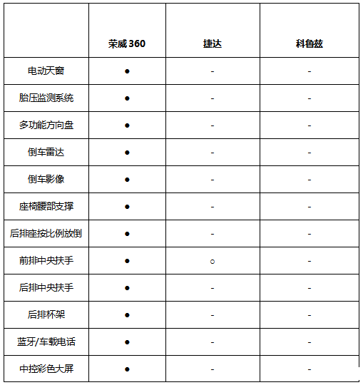 其他配置方面,电动天窗、胎压监测系统、多功能方向盘、蓝牙电话、倒车影像这些科技含量较高、且很实用的功能,荣威360相比其他两款同级车全都配备了。同时荣威360还配置了日间行车灯、驾驶座腰部支撑、后排杯架、车窗防夹手功能等人性化设计,这些也都是其他两款车都所不具备的。荣威设计师这次真是为消费者乘坐时的舒适性、便利性动足了脑经。