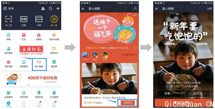 打开支付宝,按照如图简单的三个步骤就可以参与到支付宝免费午餐“爱心捐赠”活动中来,只要网友每捐赠一份钱,无论金额大小,凯翼汽车都会额外配捐1元钱,与大家一起奉献爱心。活动截止日期为2月22日,凯翼汽车表示将捐赠不少于100万的爱心款项。