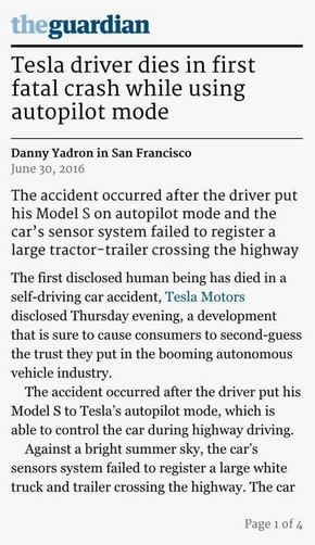 特斯拉Model S轿车在自动驾驶模式情况下追尾前方大货车,导致驾驶人死亡。据外媒报道:此次事故的原因是特斯拉的探头对前方卡车造成误判,以至于根本没有采取制动措施,直接撞入车尾造成了悲剧。特斯拉的雷达探测到了物体,但由于卡车底盘的高度相对于特斯拉的传感器位置太高,所以系统有可能认为是一个路上的标志牌,所以没有刹车。 ![]() 由于现在雷达探头的传感器的技术障碍,单一的传感器是很难做到三维空间测量的,也就是说雷达只能测到前方是否有障碍物,障碍物离车辆的距离,至于障碍物的高度和宽度是很难在极短的时间内做出判断的。 ![]() 如果说关于自动驾驶汽车的技术问题我们还能分析明白,并且能够通过研发慢慢找到解决方法,那关于自动驾驶汽车在出事故后的责任问题,就是我们现在面临的一个更加头痛的问题,甚至它也是决定着自动驾驶汽车能够发展的关键。传统汽车发生交通事故后,都有成熟的交通法规和保险理赔,民事赔偿,如果涉及到交通肇事也能有相对应的刑责,所以事故责任判定及解决都不是难题。 而在无人驾驶汽车里,则面临很多难题。除了责任判定比较麻烦外,找到责任的主体也是对当今法律的一个挑战。在传统事故中,驾驶员无疑是责任主体之一,但当一个汽车没有了驾驶员的时候我们该去找谁负责呢?首先我们想到的肯定是汽车的生产者,根据《消费者权益保护法》第35条规定:消费者在购买、使用商品时,其合法权益受到损害的,可以向销售者要求赔偿。销售者赔偿后,属于生产者责任或属于向销售者提供商品的其他销售者的责任的,销售者有权向生产者或者其他销售者追偿。而《产品责任法》中也是类似的规定。由此可知根据现行法律,如果在我国的话,似乎特斯拉也就是汽车的生产者就是赔偿的责任主体。 但是这样的判定似乎也有些不合理,也只能是在现有的法律体系下做出,因为法律的滞后性,在世界范围内还没有比较完善的对无人驾驶汽车事故的判定标准,作为一个新生事物,相关的法规严种滞后于无人驾驶技术的发展。即使在2015年底,美国加利福尼亚州首次为全自动无人驾驶汽车制订法规,也并未对发生交通事故后的责任认定做出详细的规定。 如果一味的按照传统法律来判定,无疑对无人驾驶汽车的生产厂家也会是一场灾难。试想一下,如果未来的发展趋势是每年几十上百万辆的无人驾驶汽车上路的话,面对这么大的数量,哪个厂家敢承担这么大的风险呢?谁还敢在这方面去如破创新呢?所以与其说是技术手段在制约着无人驾驶汽车的发展,更不如说是政策和法规的滞后是它发展最大的阻力。 如何破? 关于如何解决这个问题,已经有不少的方案在讨论。有建立特定区域和特殊车道来规定无人驾驶汽车行驶范围的,有根本不进行销售自己组建无人驾驶车队的等等。但是这些我看来都是在从技术的角度来解决,都是临时性的手段,都是治标不治本。对科技的发展速度,我们不能用现在的常规思维去考虑,而相应的规则和政策的制定也要有一定的前瞻性。技术性的手段都是解决汽车带有无人驾驶功能所遇到的问题,但无人驾驶汽车和汽车带有无人驾驶功能是完全不同的两个问题,我想现在每一个投入巨资研发的厂家都不只是想把它当做一个功能来开发的,都是看到了未来巨大的无人驾驶汽车市场。 一个真正的无人驾驶汽车我们要容忍它的成长所需要的时间,它完善过程所需要付出代价。所以,从法律上赋予它责任主体的资格才是根治的方法。这话听起来有些吓人,就像要机器人当成人对待一样。《机器人也是人》一书的作者、律师约翰-弗兰克-韦弗称,如果我们希望让机器人为我们做更多的事情,那么我们可能就需要赋予他们法律主体资格。“如果我们对待机器人就像对待真人一样,那么法律就应该认可我们与机器人之间的互动等同于我们与真人之间的互动。”这样的情况虽然听着有些惊悚,但却是科技发展不可逆的趋势,也同样适用于自动驾驶汽车。 汽车的自动驾驶在现阶段还是存在一定的技术瓶颈的,只能说特斯拉在汽车的自动驾驶功能方面走在了前面,但是由于它可能有点急功近利太急于求成了,硬生生的把一个现在还只能算是司机的辅助驾驶功能宣传成了自动驾驶汽车。在把消费者的期望值提的很高的情况下,自然让人很难接受出现交通事故,破坏了消费者对自动驾驶汽车的第一印象。我们只有接受自动驾驶汽车也会出现问题,认可它是在逐步完善过程中,在这个过程中我们要完善相关法律和政策,去适应它的这个过程,去解决它在这个过程中所出现的社会问题,而不是去否定这种新生事物存在的合理性,这样才是推动这个行业发展的保障。 (责任编辑:陈亮) |