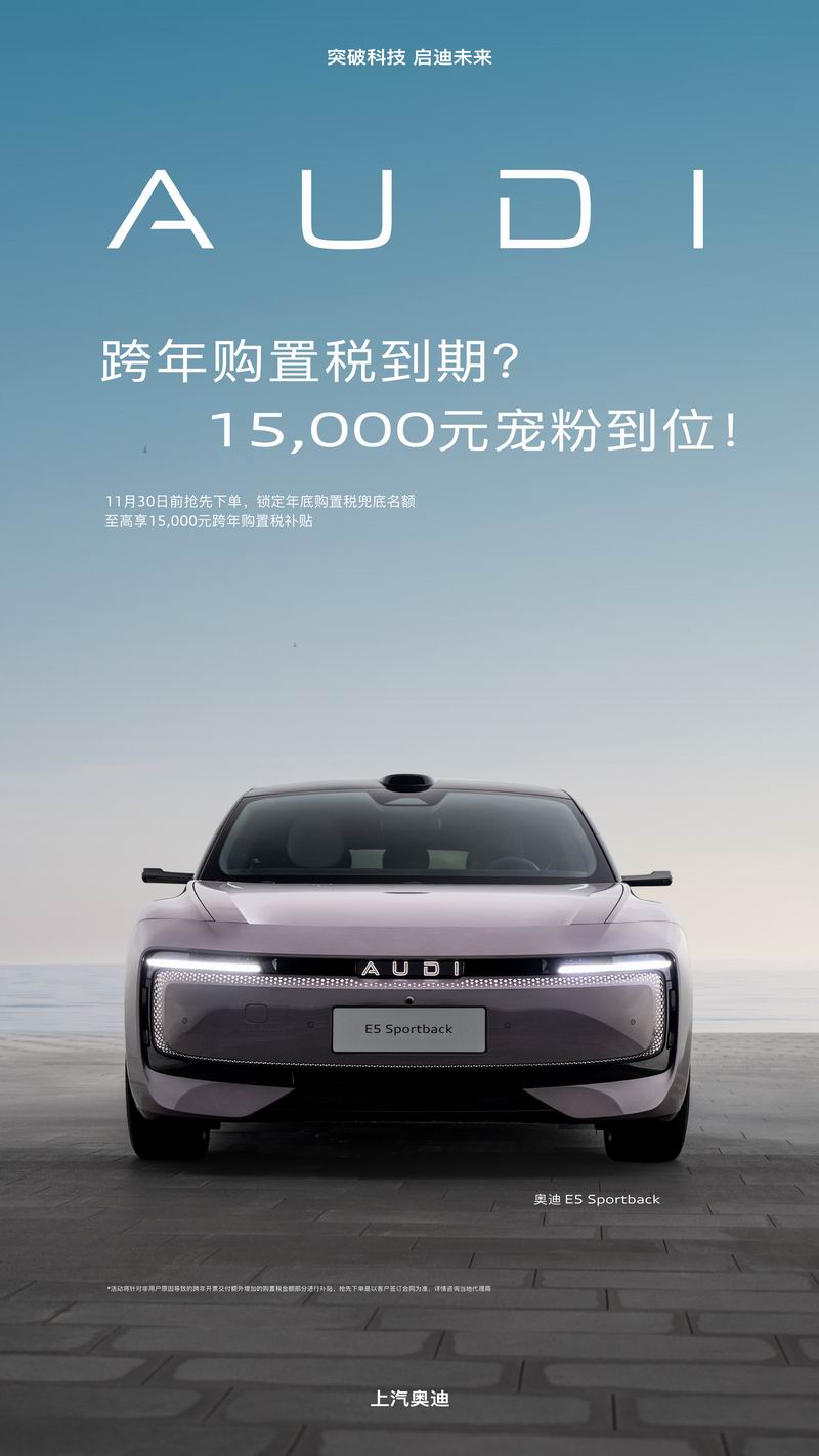 2025年11月3日,上海 – 随着新能源汽车购置税政策进入调整倒计时阶段,为回馈广大用户的支持,让更多消费者轻松拥有豪华智能出行体验,上汽奥迪针对奥迪 E5 Sportback推出跨年购置税补贴计划。11月30日前抢先下单,如因非用户原因导致车辆在2026年交付,即可享受至高15,000元的购置税补贴。该计划覆盖目前在售的奥迪 E5 Sportback全系车型,即刻预定,锁定补贴权益。