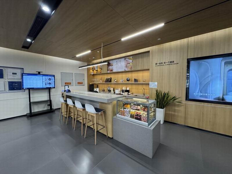 旁边就是车辆交付区。几台即将交付的新车被清洗得光洁如新,系着红绸带,整齐地停放在明亮的灯光下,整个区域同样保持着高标准的整洁有序。